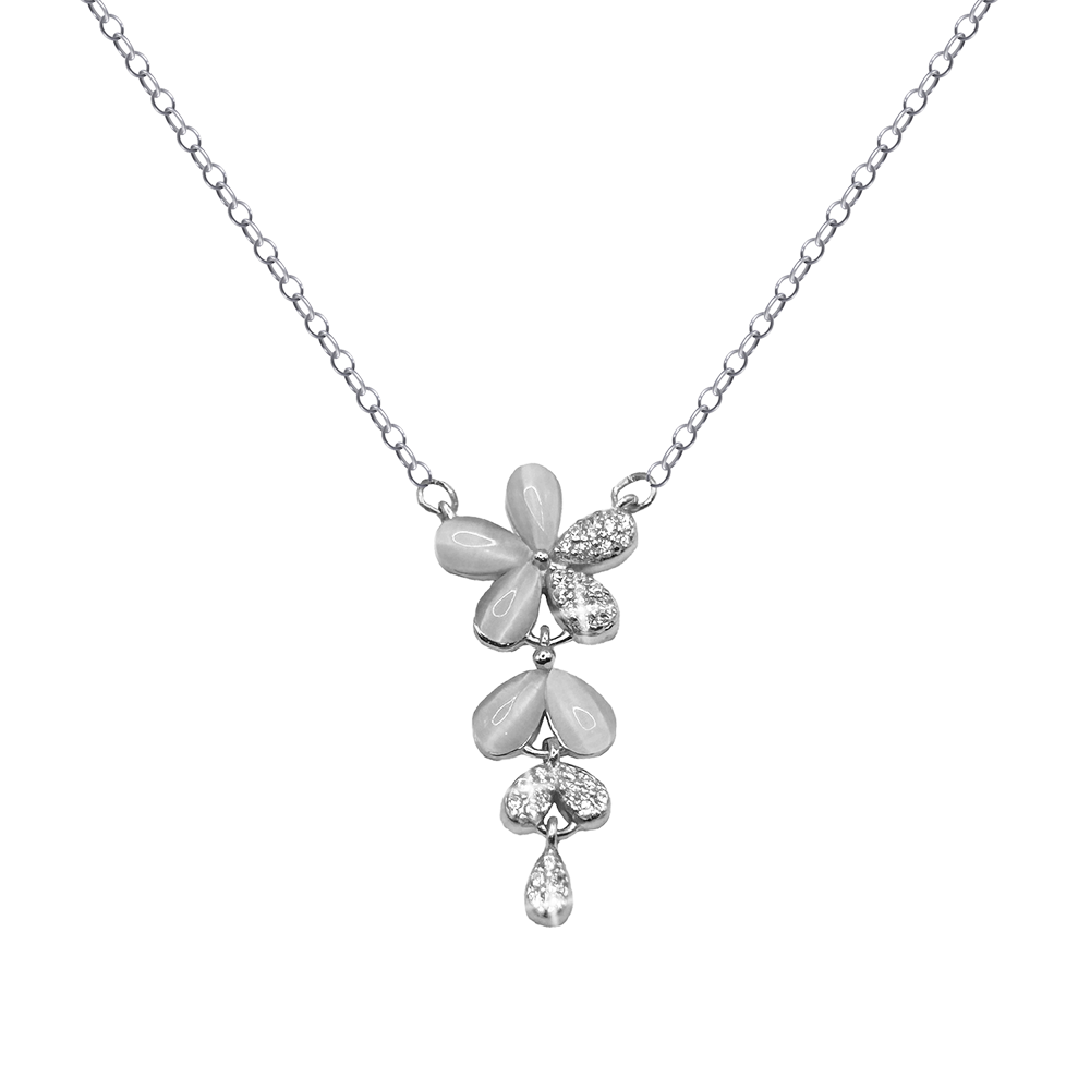 The combination of smooth petals and subtle sparkling accents creates a refined look, making it perfect for both everyday wear and special occasions. Suspended on a fine silver chain, this piece adds a soft, feminine charm to any outfit.
